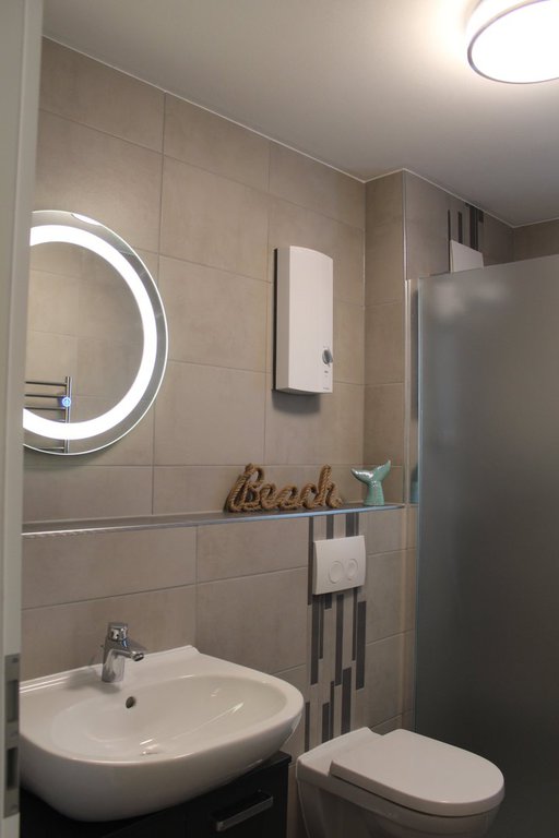 Duschbadezimmer mit ebenerdiger Dusche, großem LED-Spiegel, Vergrößerungsspiegel , Föhn und elektrischem Handtuchheizkörper