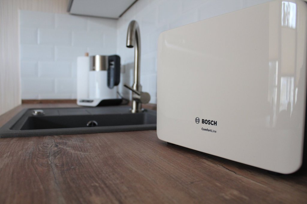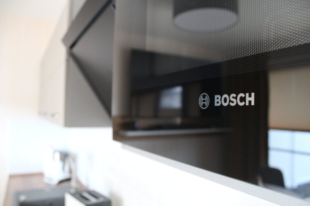 Küche inkl. Ceranfeld-Herd mit separater Backofen, Geschirrspülmaschine, Einbaumikrowelle, Kühlschrank mit Gefrierteil, Kaffeemaschine, Toaster, Wasserkocher